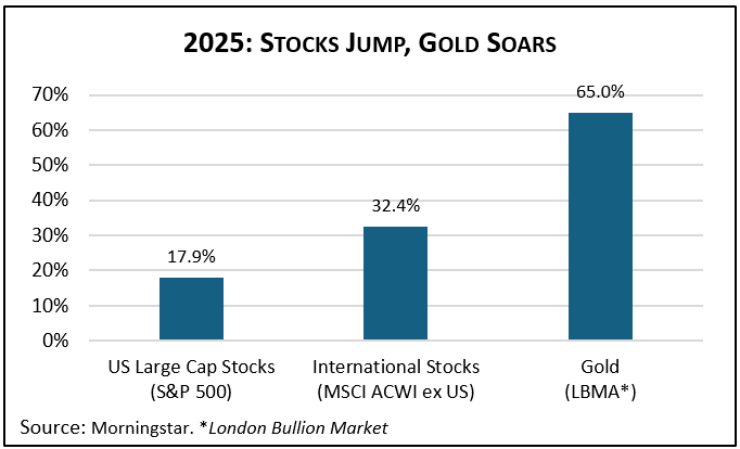 2025 was another banner year for US stocks, with the benchmark S&P 500 up 17.9%—this on the heels of returns of 26.3% and 25.0% in 2023 and 2024. The compound average return for this 3-year stretch is 23.0%, a rate at which money doubles about every 40 months! Over the past century, US large cap stocks have averaged a compound annual return of 10.5%, still terrific, but well below recent experience.